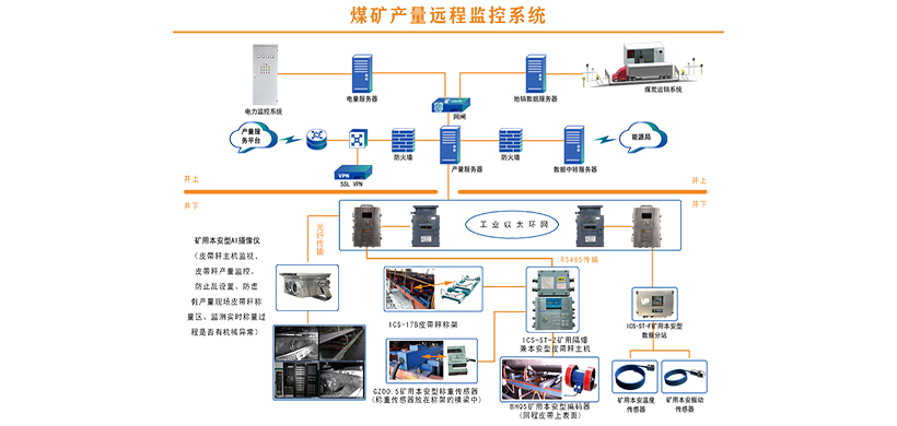 系统主要由矿用隔爆兼本安型皮带秤主机、矿用称重传感器、矿用速度传感器、矿用本安型摄像机、矿用本安型数据分站、矿用本安温度传感器、矿用本安振动传感器、矿用防爆交换机以及《煤矿产量远程监控系统》软件系统等组成。